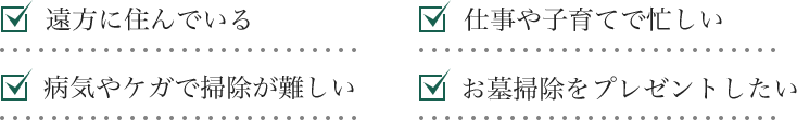 最近はなかなかお墓参りにも行けておらず、今お墓がどんな状態になっているのか気になっている。昔は定期的にお墓参りにも行っていたし、親戚の誰かが見てくれていたけれど引っ越してからはお墓に行く機会の減ってしまった。行こうと思えば行けなくはないけれど、まとまった時間がとれない。現状のお墓のチェックだけでもしてもらえないか。